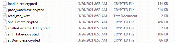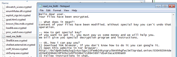 First, HelloKitty searches for files inside the system folder tree and then encrypts all the files adding a new extension: .crypted. Also, a ransom note file dubbed “read_me_lkdtt.txt” file is dropped into every folder it accesses.