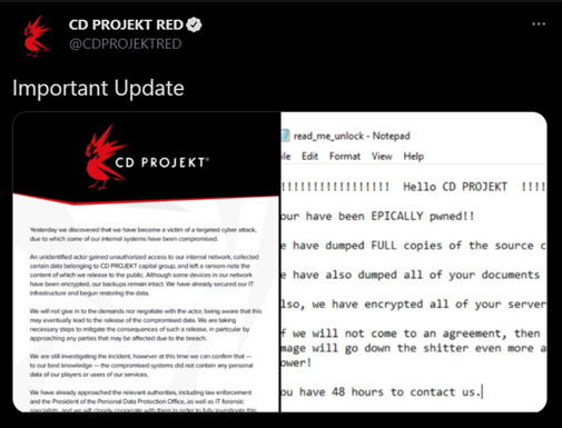 "An unidentified actor gained unauthorized access to our internal network, collected certain data belonging to CD Projekt capital group, and left a ransom note the content of which we release to the public. Although some devices in our network have been encrypted, our backups remain intact. We have already secured our IT infrastructure and begun restoring the data," the company said in a statement it released.