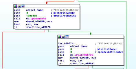 The name HelloKitty comes from its mutex name called “HelloKittyMutex” created when the malware is executed. Figure 4 below shows the blocks of code responsible for creating the mutex: ds: CreateMutexW.