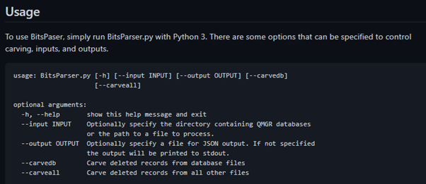Figure 5: GitHub page of BitsParser and tool usage.