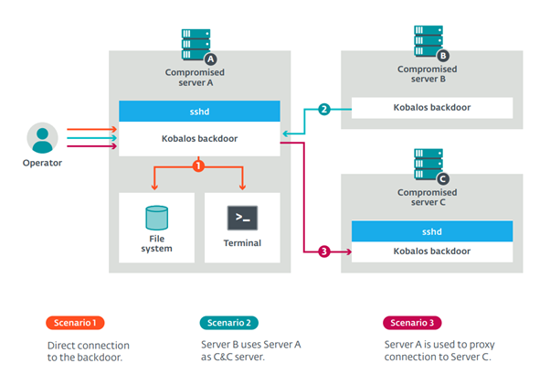 The initial foothold is achieved by compromising credentials to gain administrative access and then install the Kobalos backdoor. Criminals then use an SSH service in the form of a trojanized OpenSSH client.