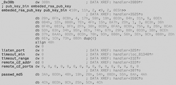 An interesting detail that makes this backdoor unique is that each Kobalos-infected host acts as a C2 server. As the C2 server, IP addresses and ports are hardcoded into the executable, the operators can then generate new Kobalos samples that use new C2 servers available and hosted on the target’s infrastructures.