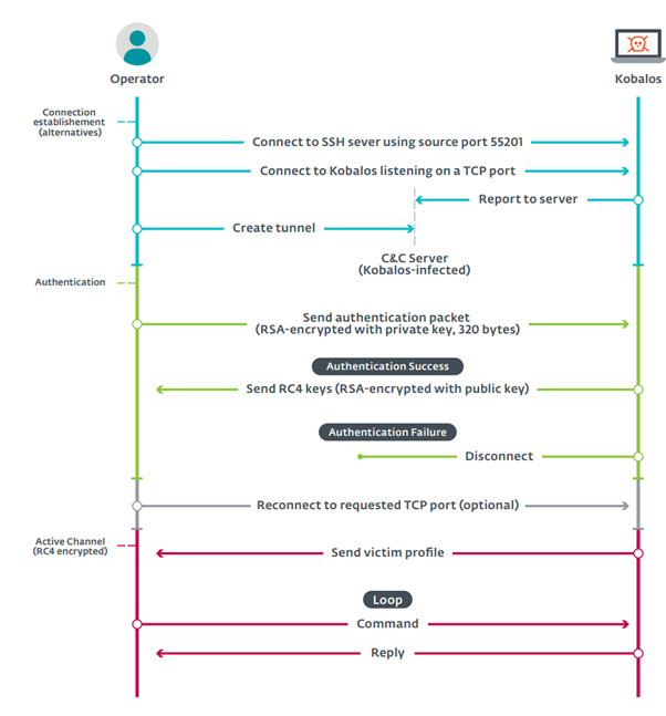 The usage of the backdoor requires a private 512-bit RSA key and a 32-byte-long password. When the malware operator is authenticated, RC4 keys are exchanged between infected hosts and operators’ machines, and the rest of the communication is encrypted with them. The network protocol is summarized by the next diagram.
