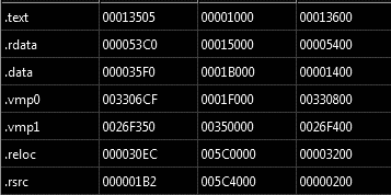 Figure 2: Binary sections (vmp0 and vmp1 — VMProtect packer).