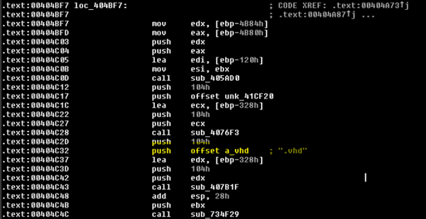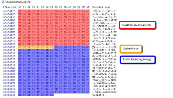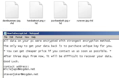 Every time a file is encrypted, it is renamed. The extension “.vhd” is appended to the end of the file name.