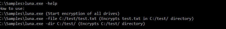 The ransomware has a command-line interface with simple features implemented, as observed below.