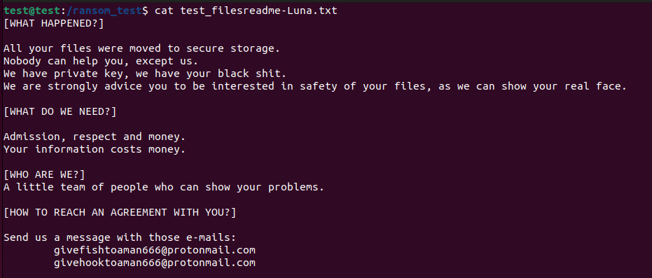An interesting detail observed during this analysis is that Luna's source code seems to be adapted to the Russian language, probably indicating the group’s targets are not part of the former USSR (Union of Soviet Socialist Republics). Within this context and to corroborate the previous thought, the ransomware note is written in American English, with some grammatical errors probably indicating an automatic translation from another language.