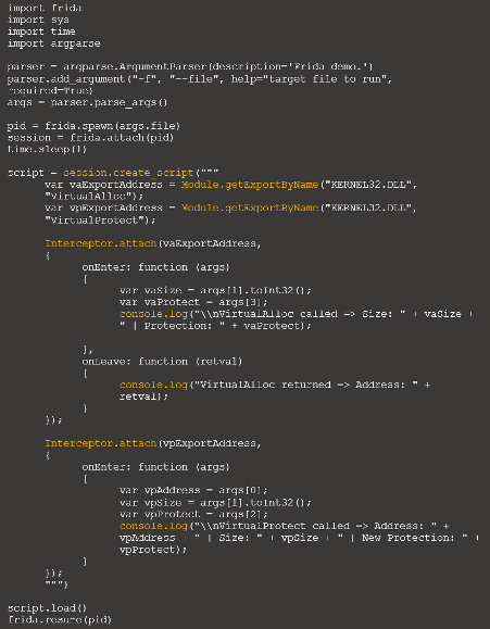 As demonstrated below, tracing the memory injection technique is possible with an initial script. In detail, the "VirtualAlloc" and "VirtualProtect" Win calls are monitored, and their content is shown when triggered.