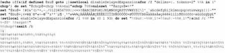 After downloading the ZIP file, an undetectable batch file with at least two obfuscation layers is executed. The initial process is a simple cipher substitution algorithm, replacing all the symbols with a lookup table available on the script.