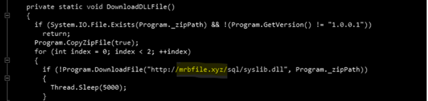 Figure 4: Function DownloadDLLFile executed to download the next stage from the MRB domain.