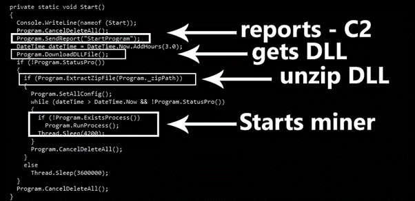 By analyzing the malware source code, we can find a function called “ExtractZipFile” is invoked when the DLL file is retrieved, confirming the file is a zip archive. After that, some settings are fixed and the malware starts the mining activity.