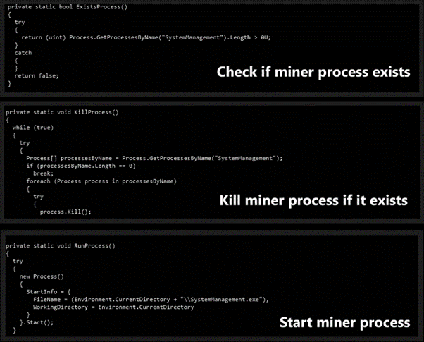 The malware is capable of getting all the running processes and match them with the name of the miner to avoid multiple processes being spawned. This is a good point from the criminals’ point of view, as multiple processes of the miner would reduce the machine’s performance and the mining process itself.