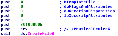 Then it sends an I/O request to the target volume to get the disk number. The result is the physical drive that contains the Windows installation e.g: .PhysicalDrive0. This will be used to open a handle to the drive, as you can see in the next figure, and write to its sectors.