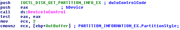 Next, the sample queries the disk's partition information by sending the IOCTL_DISK_GET_PARTITION_INFO_EX request to the underlying disk device. Upon returning from DeviceIoControl, the OutBuffer contains a PARTITION_INFORMATION_EX structure. The sample is only interested in the partition style to determine how the overwriting will be done (the PartitionStyle field)