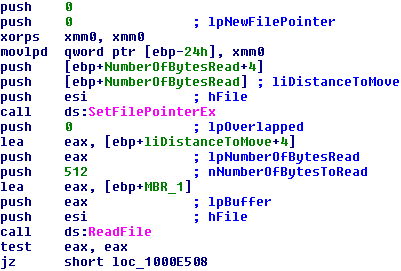 If the partition style is MBR, a handle is opened to the physical disk and the file pointer is set to the beginning of the first disk sector (the MBR) before it's read into the buffer.