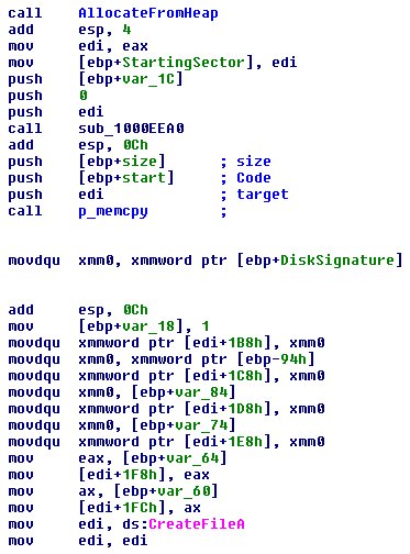We see afterward that an allocation is made, and the .xxxx section (except the first 16 bytes) is copied to the allocated memory. What Petya does next is modify the first 512 bytes of the allocated memory so that the only difference between it and between the first sector of the disk is the bootstrap code area. It starts from the Windows signature field at offset 0x1b8 and copies all the bytes until the end of the 4th partition entry.