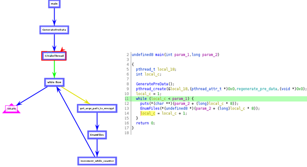 An important piece to highlight is the pthread_mutex_lock e pthread_mutex_unlock function, a mutex used by ransomware to control the encryption flow.