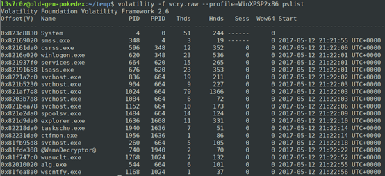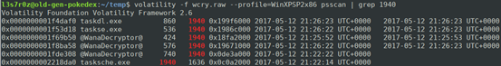 As can be seen above, there are two very suspicious processes that are not normally part of Windows. (Identification can simply be done by Googling the processes and determining suspicious ones). These are tasksche.exe and @WannaDecryptor@. For us to be able to identify the process hierarchy, we use psscan to identify the tasks which were started by tasksche.exe (PID 1940):