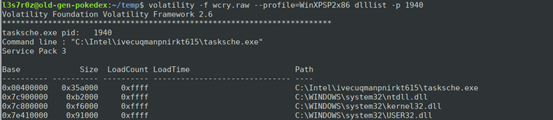 Notice that above, the PPID for the five processes is 1940, indicating they were started by tasksche.exe. We need to now determine the folder path which the process executed from, as well as the dlls used. To do this, we use the dlllist plugin. See below:
