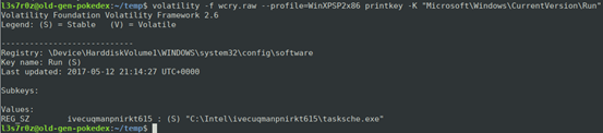 We can then extract the key values that are used to perform persistence by using the printkey plugin. We search through the Run, Runonce, WinlogonKeys, BootExecuteKey, Startup folders and Services key. In this case, the Run key is as shown below: