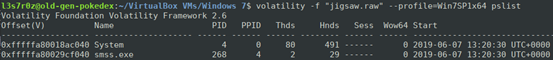 Before we can begin working with Volatility, we need to identify some information on the jigsaw.raw file. For instance, we’re particularly interested in the profile, which according to our Windows 7 install is Win7SP1x64. See more information below: