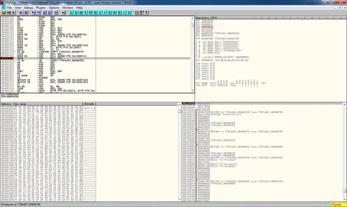 0040871E 8B41 30 MOV EAX, DWORD PTR DS:[ECX+30] ß mov to EAX the pointer to the name of the first module name loaded by the windows loader.
