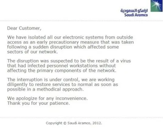 On August 15th, 2012, the Saudi Arabia's oil company, Saudi Aramco announced that its systems and its internal network were victims of a cyber-attack. According to the company, malware infected more than 30,000 workstations; it was the Shamoon malware, also known as Disttrack.