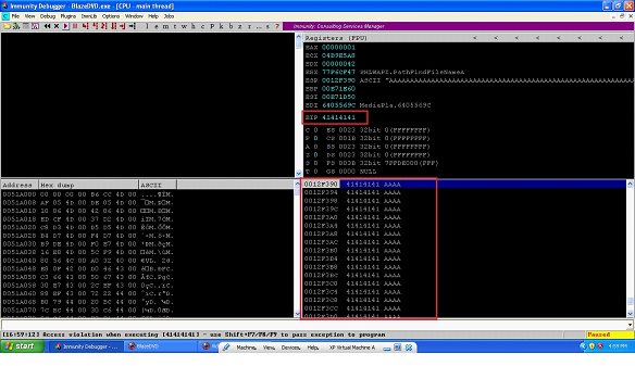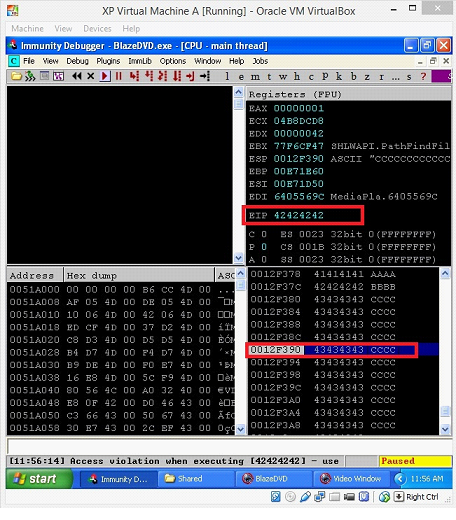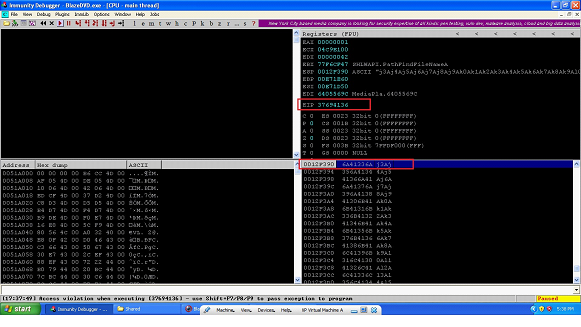 As can be seen in the above screen shot, when we run the DVD player software with the debugger and open the playlist file on the DVD player the software is crashed. We could see that EIP is successfully overwritten with the 41414141 which is our A in the Hexadecimal. This shows that the software is vulnerable with the buffer overflow, now let's move on to the next step.
