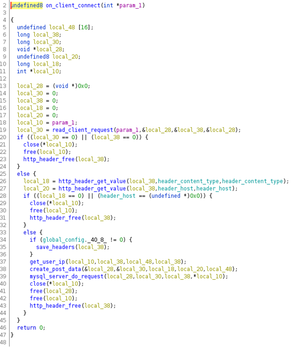 Every time a new client is received, the “listen_socket()” function is called. A new thread is created by client (Figure 9 — line 33), and the code inside the “on_client_connect” function is executed. The Stantinko malicious code is here.