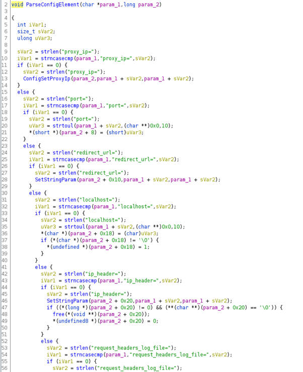 After executing and the configuration file exists, an interesting function responsible for parsing the file is invoked inside the LoadConfigFromFile() call. This specific function — ParseConfigElement() — reveals in part the structure of the configuration file that is expected to have the following keys:
