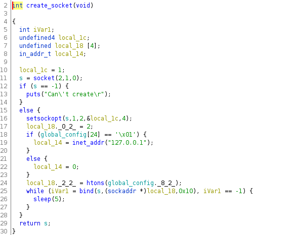 After loading the configuration into the memory, the daemon starts, as presented in Figure 6 above (start_demon() function). A socket and a listener to accept new clients are created. Create socket (Figure 8) and listener function (Figure 9) are presented in the next images.