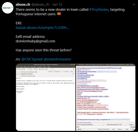 The threat was initially detected by Abuse.ch on Jun 12th, 2020. It was seen as a new stealer in town which targeted Portuguese internet users, and no other samples had been analyzed before.