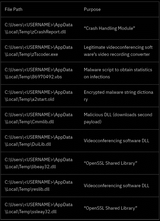 As described in this case, Vizom’s malicious DLLs are saved in the same directory of the executable file that loads them into the memory during its execution. In this case, the malicious DLL’s name was taken from a popular videoconferencing software: “Cmmlib.dll”.