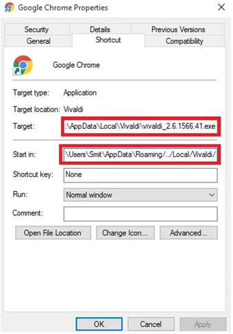 To ensure that the malware is executed every time the user’s device is started, Vizom modifies the browser’s shortcuts and adds the malicious path where the Vivaldi software is installed. When executed, the browser is launched as a child of Vivaldi’s process (see Figure 4 above). The browser’s shortcuts are modified according to the next table.