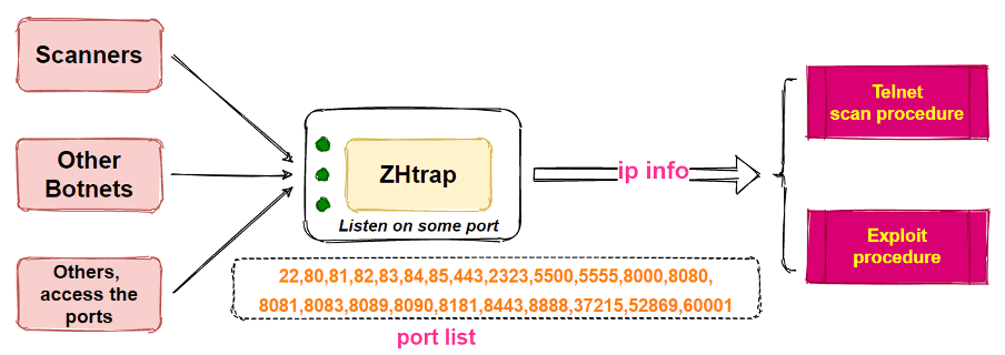 Figure 2: How ZHtrap uses an IP collection module and the hardcoded ports inside the binary file (source).