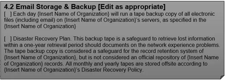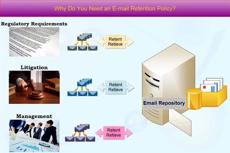 Simply put, an e-mail retention policy/ERP is the process of keeping emails for compliance or business reasons. It differs from archiving (although these terms can be used interchangeably) in the fact that a retention policy decides when to dispose of redundant electronic messages, while the latter may keep them indefinitely. Therefore, an ERP should set forth parameters for which e-mails are to be stored, for how long, and the exact mechanism of their disposal. This schedule must also consider the regulatory timeframes for email preservation and other requirements applicable to your industry, if there are any.