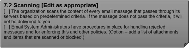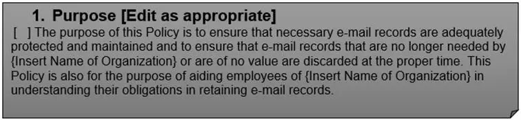 The Scope section, as shown in the text box below, aims to embrace all types of e-mail messages subject to retention rules. Anything left outside should be treated per se as an exception, therefore handled manually. In other ERP versions, this part can also include staff who is entrusted to create, send, receive, or retain e-mail messages and attachments.