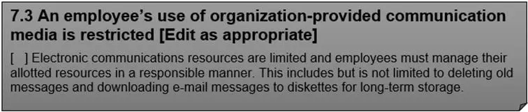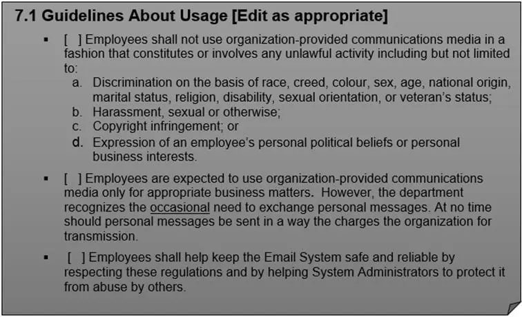 Your organization's policy should also include a disclaimer that all e-mails composed at the organization's ground are not private and may be constantly monitored. Without such a clause, the firm risks violating an employee's right to privacy when they investigate harassment or a discrimination claim.