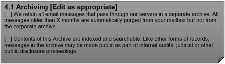 In general, employees are likely to take the policy to their liking and the courts will be more accepting when the company shows real effort to manage e-mail business records effectively, following laws and business objectives. Furthermore, to show compliance to outside institutions, the organization must be able to prove that it has put in resources and willingness to get what policy they have (regardless of its potential flaws) to the attention of their personnel.