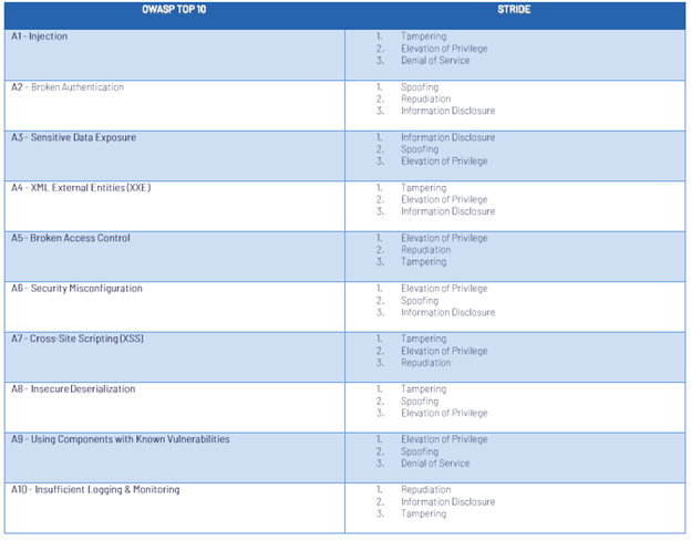 To facilitate this process, one of the RTMP documents applied the OWASP Top 10 attack methods to the STRIDE elements to which it relates. The following table can assist in identifying potential mitigations to the top system risks based on their STRIDE-related vector: