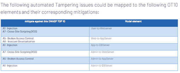 The result should be a version of the system diagram for each STRIDE element, notated with its zone ranking applied and mapped to the OWASP threat(s) that could be realized, in order of probability to occur. The OWASP model, as well as other existing risk mitigation and cybersecurity best practices, can be used to identify security controls that can eliminate or lessen the potential or impact of the threat if realized.