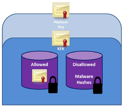 In the Microsoft model, firmware and the boot loader are integrity checked using signatures as well as measurements. The objective is to ensure all executables are signed and the signature public keys stored on the target platform in an "allowed database." (Edge, 2011). Prior to boot loader execution, for example, its signature is checked, as shown in Figure 11. KEKs are typically unique for each component. If the signature is invalid, the executable is managed according to user-defined policy.