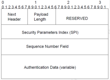 From the image just shown, we can see some different fields. "Next Header" field identifies the transport type, like TCP. The "Payload Length" identifies the length of Authentication Header. The SPI field identifies the security parameter index which will be used to identifying the SA. The "Sequence Number Field" is a counter that increments by 1 when a sender or receiver receives or transmits data. Through SNF, an anti-replay protection is provided, because when the receiver receives a packet with a duplicate Sequence Number Field, this is discarded (we can see at "Session Replay" attacks in IPv4).