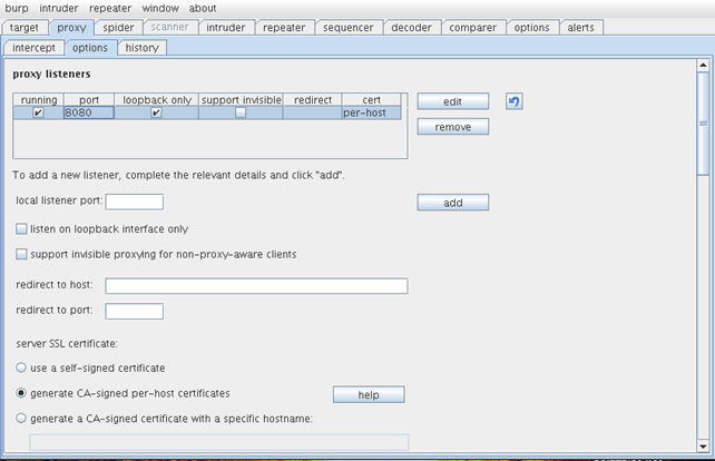 Great, Burp is now listening on port 8080 on all interfaces. Remember that you can as easily change the port to a number of your liking, so you don't have to use 8080 if you don't like or if you already have some other service listening on that port.