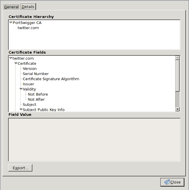 First we have to export the CA certificate from Burp. We can do that by first setting up the proxy in Firefox or some other browser and then visiting an HTTPS-enabled web site. At that point, the web browser will present a warning notifying us that the certificate is not trusted. We need to add exception for that certificate and export it at the same time. To export the certificate, we must view the details of the certificate, which can be seen in the picture below: