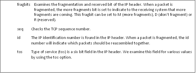 These four options, flow, ack, flag and ttl all examine the TCP or the IP header of the packet. As such, they are relatively efficient and use just a few CPU cycles, unlike say, delving into the payload and examining all the data there. Snort has a number of other options that examine fields in the TCP or IP header that may indicate a malicious packet. A few of these are listed below.