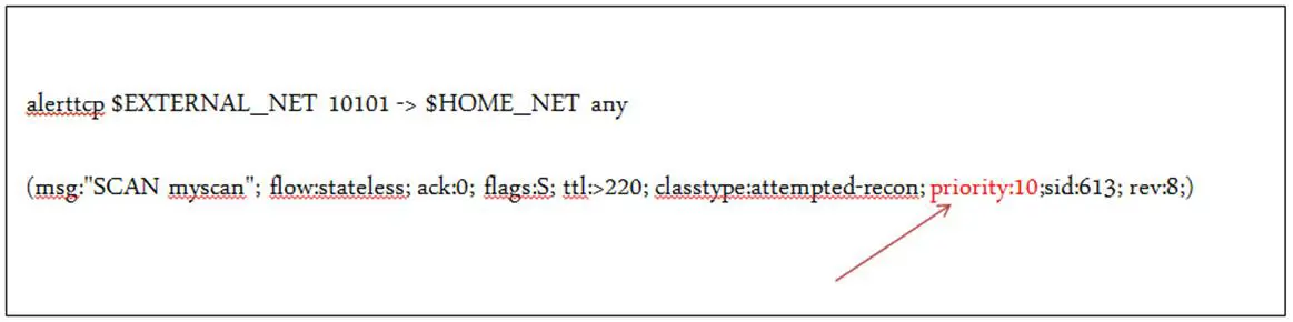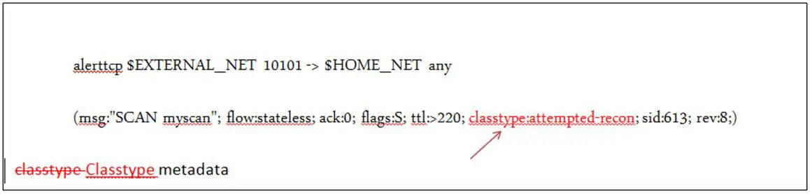 Just one classtype has a very low priority: tcp-connection. Our sample rule is classified as an attempted-recon, making it a medium priority. If we wanted to change its priority to say, very low, then we could simply re-write the rule as below.