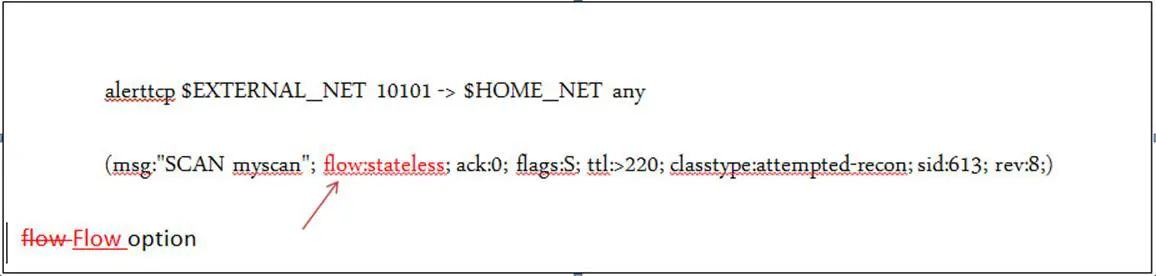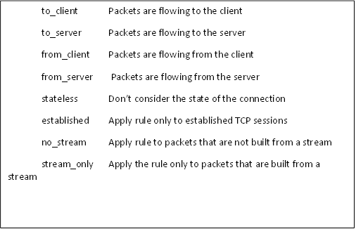 The very next field in the options section is the flow option. This enables us to define a flow state for the traffic on our IDS. Just like a firewall that can track state, e.g. a stateful firewall, we are able to define whether we want to look for traffic that has an established connection. We can look for "established" or "stateless" sessions. In our example here, we followed the keyword flow with stateless which means that this rule will apply without considering the state of the TCP session. Other options here include, established, no stream, stream only, to_client, to_server, from_client and from_server. The table below summarizes these flow options arguments.